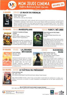 La MJC de Saint-Gervais a voulu s'investir pour le développement du cinéma, notamment en direction des publics jeunes, à travers une démarche bénévole. Avec 6 séances maximum par mois, nous ne pourrons pas programmer des films en sortie nationale, mais un cinéma de découverte et familial. La programmation sera menée par les bénévoles de la commission cinéma de la MJC. Nous faisons d'ailleurs appel à toutes les bonnes volontés voulant s'investir dans ce projet. Pour cela rien de plus simple ! Il suffit de contacter la MJC et de devenir adhérent. Les séances ont lieu au théâtre Montjoie de St-Gervais chaque jeudi à 20 h 30. Programmation exceptionnelle pour les scolaires et durant les vacances en après-midi.