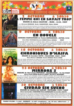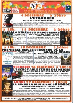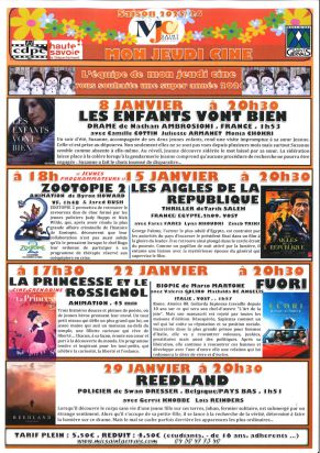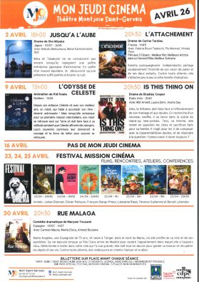 La MJC de Saint-Gervais a voulu s'investir pour le développement du cinéma, notamment en direction des publics jeunes, à travers une démarche bénévole. Avec 6 séances maximum par mois, nous ne pourrons pas programmer des films en sortie nationale, mais un cinéma de découverte et familial. La programmation sera menée par les bénévoles de la commission cinéma de la MJC. Nous faisons d'ailleurs appel à toutes les bonnes volontés voulant s'investir dans ce projet. Pour cela rien de plus simple ! Il suffit de contacter la MJC et de devenir adhérent. Les séances ont lieu au théâtre Montjoie de St-Gervais chaque jeudi à 20 h 30. Programmation exceptionnelle pour les scolaires et durant les vacances en après-midi.